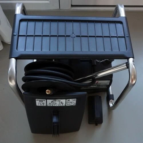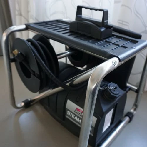 Voorzien van veilige tankdop met schroefdraad, aan- en uitschakelaar, thermische beveiliging, integrale waterniveaumeter, lichtgewicht stoomplaat, opberghaspels voor het 5 meter lange aansluitsnoer en voor de 5 meter lange stoomslang.