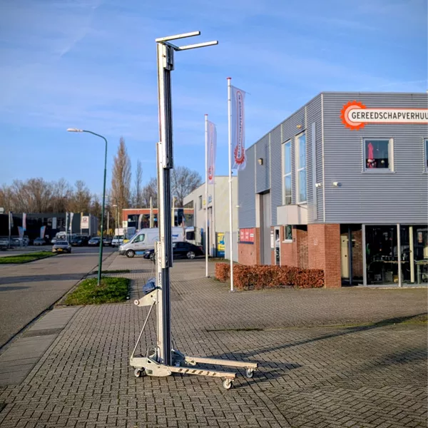 Door het onderstel in de klappen kan de lift liggend vervoerd worden en snel weer opgebouwd. Dit alles met 1 persoon.
