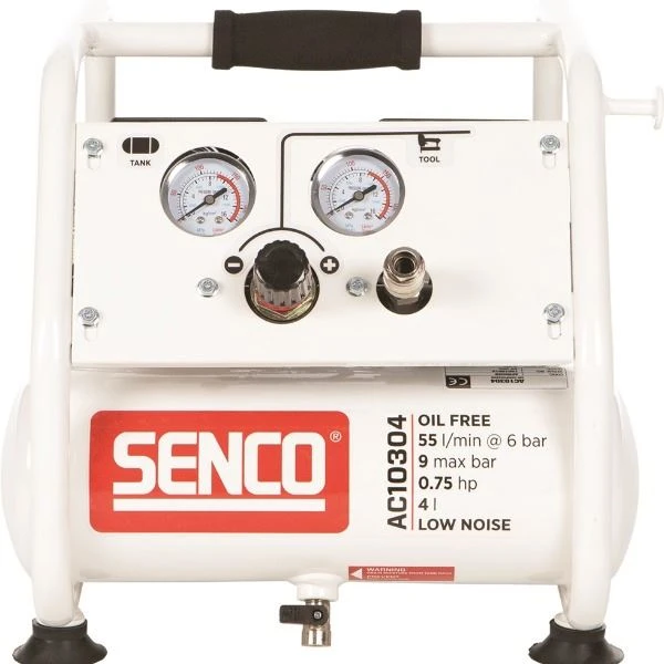 De draagbare, compacte en krachtige SENCO AC10304 compressor is de ideale olievrije compressor met een laag geluidsniveau voor dakonderbouw, asfaltkarton en gevelbekledingen. Door het verminderde geluidsniveau kunt u deze compressor direct op de plaats van gebruik plaatsen!